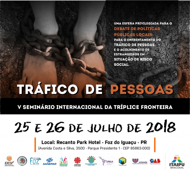 V Seminário Internacional da Tríplice Fronteira, acontecerá em Foz do Iguaçu no Recanto Park Hotel nos dias 25 e 26 de julho de 2018, o qual tratará do tema: Tráfico de pessoas.